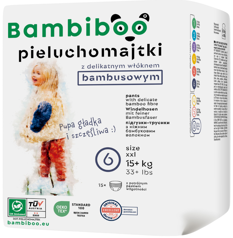 Die Windelhosen 6 sind für Kleinkinder gedacht, die ihre ersten Schritte längst hinter sich haben. Diese Art von Windeln ist die ideale Lösung für Kinder, die nicht lange an einem Ort stehen bleiben können, weil ihr Entdeckungsdrang viel stärker ist. Windelhosen sind daher eine Rettung für Eltern, deren Kinder beim Windelwechseln nicht mehr brav liegen bleiben wollen, sich wegdrehen und weglaufen oder mit den Beinen strampeln, um sich nicht anziehen zu lassen. Deshalb lassen sich Bambiboo-Windelhosen schnell und problemlos anziehen, da sie wie normale Unterhosen angezogen werden. Das gebrauchte Produkt lässt sich hingegen leicht ausziehen, indem man die Gummizüge an den Seiten aufreißt. Darüber hinaus sorgen 3D-Rüschen für Dichtigkeit auch bei wildesten Spielen. Das Anziehen von Windelhosen ermöglicht es Kindern außerdem, sich daran zu gewöhnen, Unterhosen zu tragen, wenn sie das Töpfchen benutzen lernen. Eltern, die sich für Bambiboo-Windelhosen entscheiden, können außerdem sicher sein, dass der Po ihrer Kleinen von sanften, unparfümierten Bambusfasern umgeben ist, die mit Aloe-Extrakt angereichert sind. Die Windeln sind außerdem sehr saugfähig, leiten Feuchtigkeit gut ab und lassen die Haut atmen, sodass keine Hautirritationen oder unangenehme allergische Reaktionen auftreten. Besonders praktisch für sehr aktive Kinder ist die Anzeige, die Eltern über den Füllstand der Windel informiert. So kann sie rechtzeitig gewechselt werden, ohne dass man hineinschauen muss. Die Bambiboo-Windeln sind auch ein Beitrag zum Umweltschutz – das Produkt wird größtenteils aus erneuerbaren und kompostierbaren Rohstoffen hergestellt. Die Windeln in Größe 6 sind für Kinder mit einem Gewicht von 15 kg und mehr geeignet.