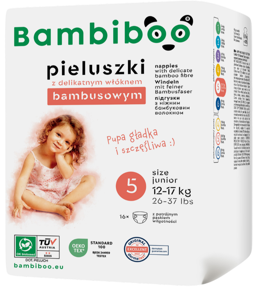 Ein zweijähriges Kind ist ein wahrer Energiebündel – es bewegt sich nicht nur selbstständig, sondern rennt meistens auch herum und ist überall zu finden. Das bedeutet, dass Eltern in dieser Zeit besonders auf ihr Kind achten müssen, vor allem bei Spaziergängen – alleinige und ungehinderte Streifzüge durch die nähere Umgebung sind der neue Alltag. Ein zweijähriges Kind klettert nicht nur gerne auf das Sofa, sondern auch auf andere Möbelstücke im Haus, öffnet Schränke, greift nach verschiedenen Gegenständen und entdeckt neue Spielmöglichkeiten. In diesem Alter ist eine strapazierfähige und gut sitzende Windel ein Muss. Die atmungsaktiven Bambiboo-Windeln haben daher spezielle elastische Bündchen, die für einen guten Sitz sorgen. Darüber hinaus ist die Windel selbst äußerst bequem für das Kind, da sie nicht parfümiert ist und mit Bambusfasern hergestellt wurde, die das Risiko von Hautirritationen und Windelausschlag minimieren. Wir wissen, dass Eltern immer häufiger zu ökologischeren Lösungen greifen. Deshalb basieren Bambiboo-Windeln auf nachwachsenden Rohstoffen, die eine kommerzielle Kompostierung ermöglichen. Windeln in Größe 5 sind für Kinder mit einem Gewicht von 12 bis 17 kg geeignet.