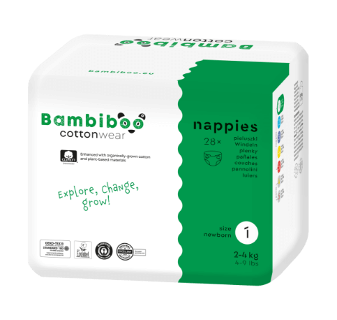 Bambiboo COTTONWEAR disposable nappies enriched with organic cotton and plant-based materials.